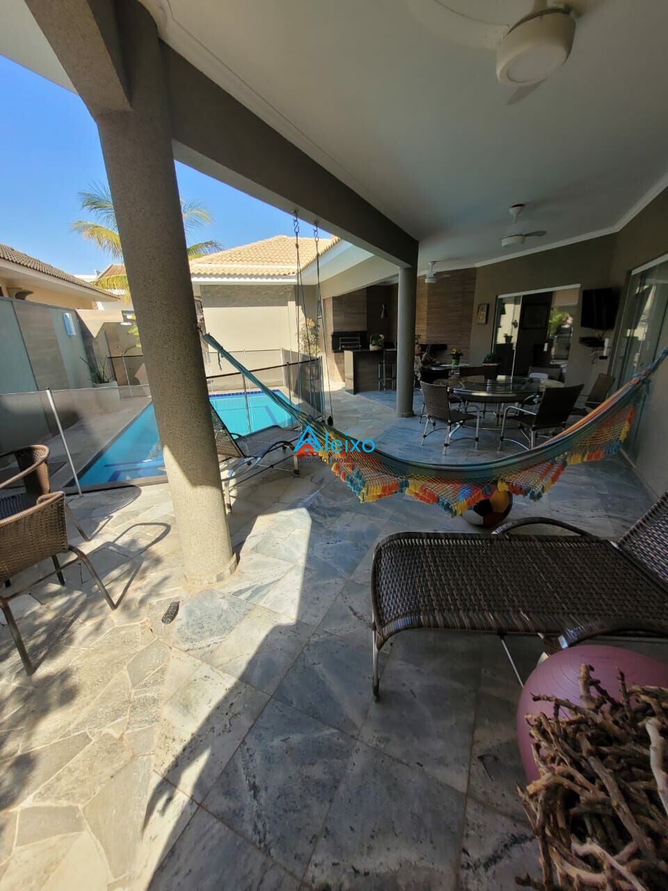 Área de lazer com piscina e churrasqueira