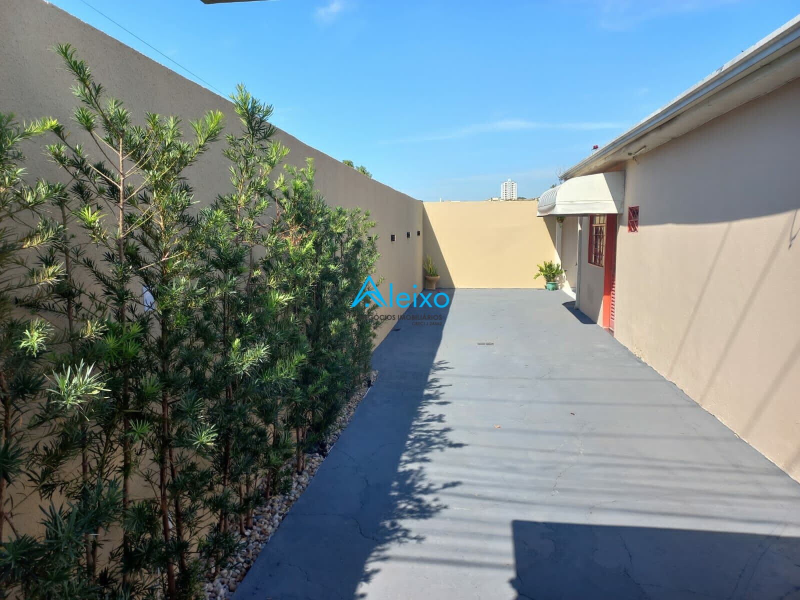 Casa com três quartos, sendo um tipo apartamento, casa ampla, muro alto, central de cerca e alarme.